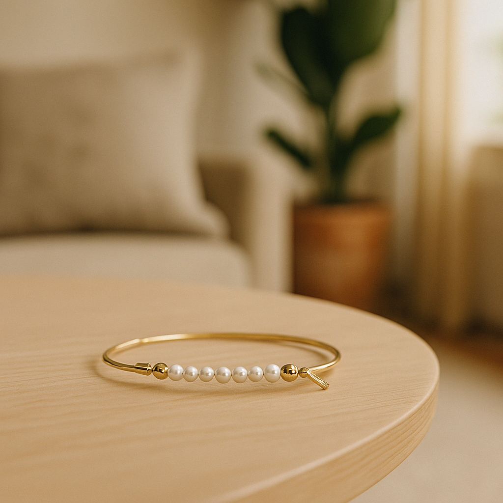 Armring i sølv med 3mm perletop og mini fjer charm.